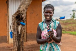 Ropani Harriet, originaire du Soudan du Sud, tient une lampe solaire réparée dans le...