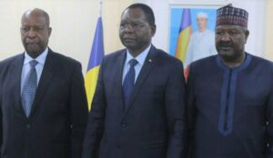 MM. Simão (gauche) et Abarry (droite) ont rassuré le Premier ministre Allamaye Halina (centre)...